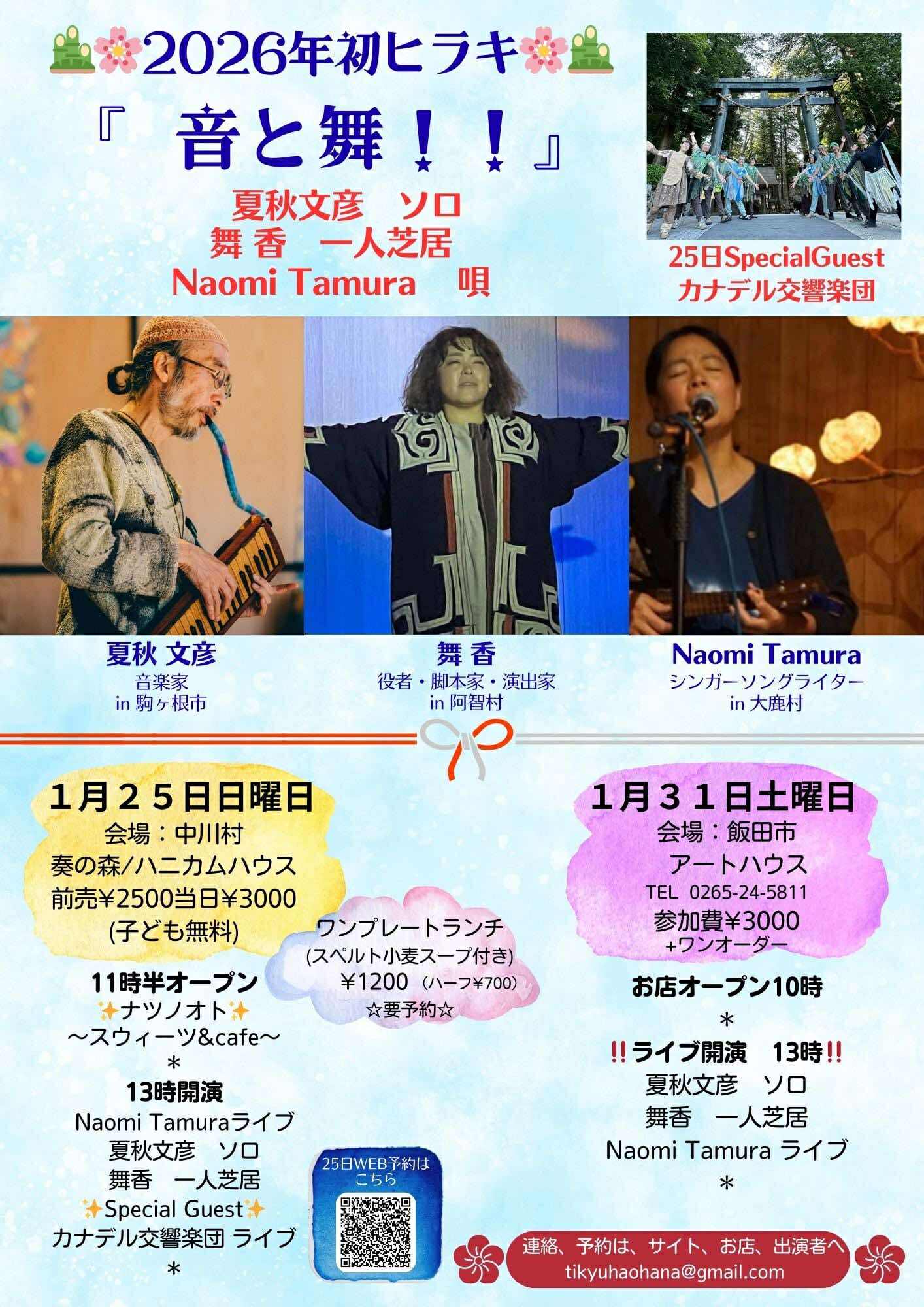 2026年初ヒラキ! 音と舞!! 1月25日日曜日 会場:中川村 奏の森/ハニカムハウス 参加費¥2500(子ども無料) 11時半オープン ナツノオト ワンプレートランチ スペルト小麦スープ付き ¥1200 ☆要予約☆